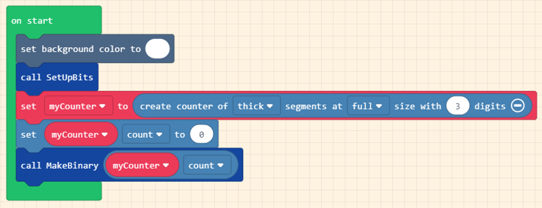 At the start of the program, we need to set up a counter from the 7 segment library and call our two functions. Click the image for a larger version.