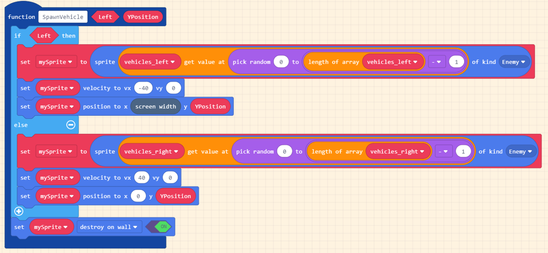 The other blocks in this function are there to define the vehicles to be used in the game. The second array is the same as the first, just flipped horizontally. The cars are 16x8 pixels, the lorry is 32x8 pixels.
