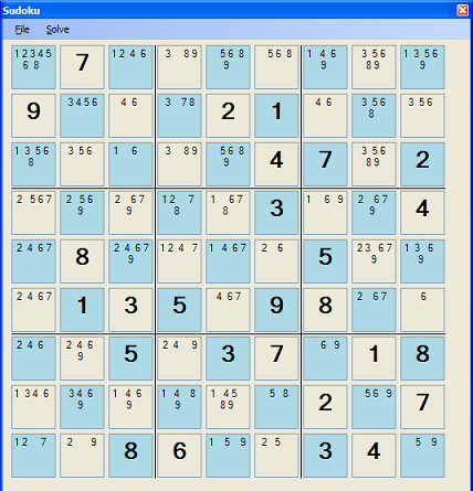 The Sudoku application is a utility to help people solve Sudoku puzzles. The screenshot shows the basic application. Numbers are entered into the grid by clicking with the right mouse button on one the the text boxes that make up the grid. The user can only choose to add values which are valid (that is, ones that are allowed in those locations under the rules of Sudoku). Each text box displays either the value that has been chosen for that cell or the list of possible values for that cell. Possible values are displayed in a small font, chosen values are displayed in a large font.