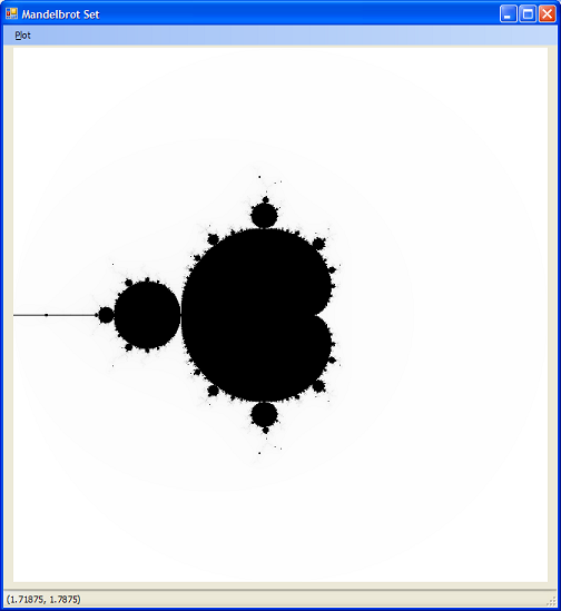 We loop through each pixel in the picture box working through a row at a time. We use the unitsPerPixel value to convert the pixel to values of c that we want to plot. We check if the number is in the Mandelbrot set and colour it black if it is. If it is not, we colour it a shade of grey according to the number of iterations that it took before the distance got too large (more iterations = darker grey).