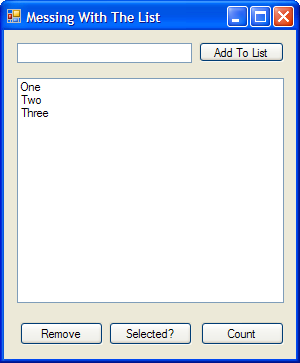 The list box control is a handy way of storing and displaying items on a form. The following program covers the most basic operations with the control.