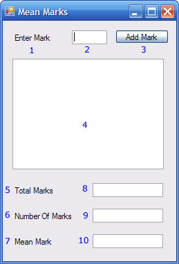 1. Below is the design for a form-based application using the list box control. Design the form as shown and complete the program so that, each time a mark is entered, the list box and text boxes are updated with the correct values.