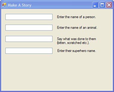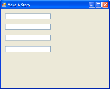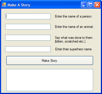 Now drag in a button immediately below the text boxes. Call the button, btnMakeStory and set its text to Make Story. Below the button, add a text box. Change its Multiline property to True, and call the text box, txtStory. Your form should now loook like the screenshot.