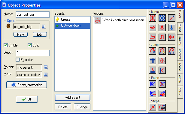 Add an Outside Room event and drag in a Wrap Screen icon so that the asteroid will return to the opposite end of the screen when it reaches the edge.