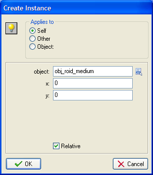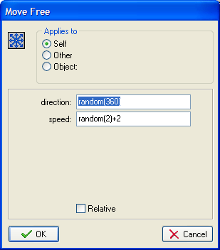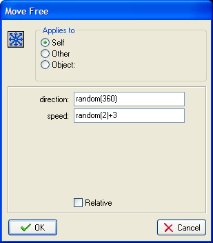 Open up the window for the big asteroid and add a Create event. Drag in the Move Free icon and fill in the pop-up as below,