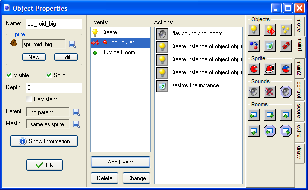 Go to the large asteroid object window and add a Collision event with obj_bullet. Drag in a Play Sound icon and play the sound that you created.