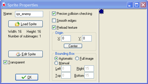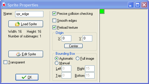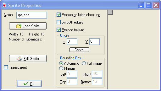 There are 4 sprites needed for this game. Pay attention to the screen shots - the character and enemy ar eboth transparent, the edge and end sprites are not. They should be created as follows,