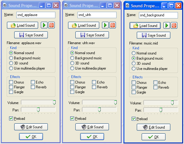 Look carefully at the settings for the background music sound. I have turned down the volume slightly on this sound so that it doesn't prevent us from hearing the other sounds that we want to play during the game.