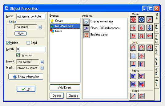 OK, so the score changes and you can now lose lives if you drop the ball. The game still isn't there yet. The game should stop when the player runs out of lives. We'll keep this fairly simple - tell them it's over, wait a few seconds and stop the game. To do this we need to add another event to the obj_game_controller. This time, add a No More Lives event (found under Other).