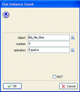 Drag in the Test Instance Count icon from the Control tab. We need to check if there are no instances of obj_tile_blue left in the room. Fill in the pop-up as shown.