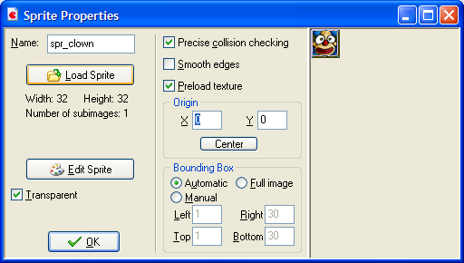 - Call the sprite, spr_clown and load the clown image. The clown is transparent.