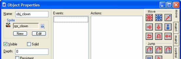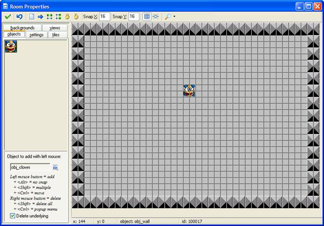 You want to set the room up to look like the screenshot. Click on the Objects Tab in the room window to draw on the screen. The wall object is placed around the edge of the room. The clown is placed in the middle of the screen.