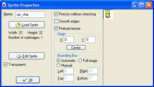 Choose to Create A Sprite called spr_ship and load the ship graphic.