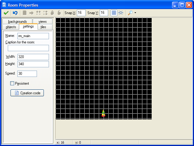 Click on Rooms and Create Room. Go to the Settings Tab and set the width of the room to 320 and the height of the room to 340. Make the background black . Return to the Objects Tab and add the ship object to the bottom of the room. Your room should now look like the screenshot.