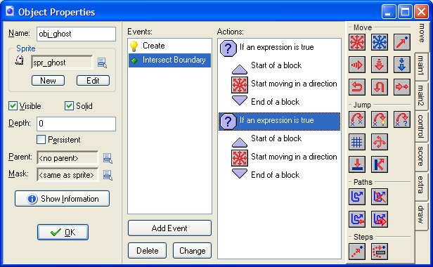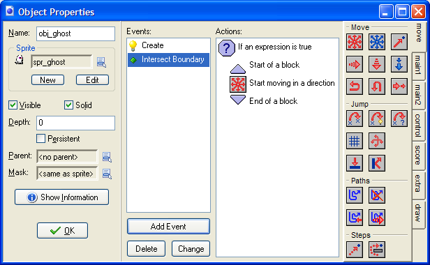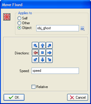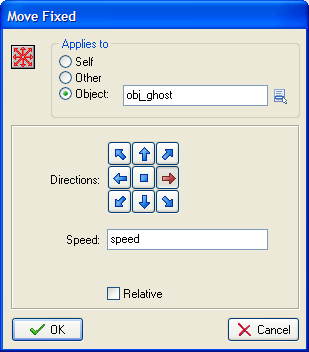 Open up the ghost object window and add a Create event. Drag in the Move Fixed icon. Click the arrow pointing to the right and set the speed to 1.