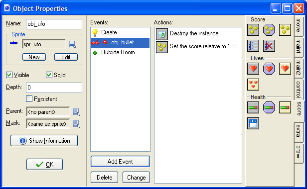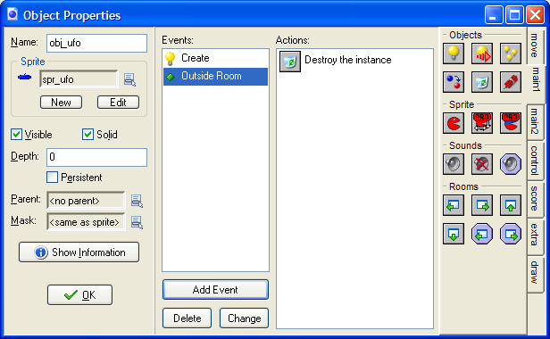 When the UFO leaves the right hand edge of the screen we want it to be destroyed. Add an Outside Room event (under Other). Drag in a Destroy Instance icon like below.