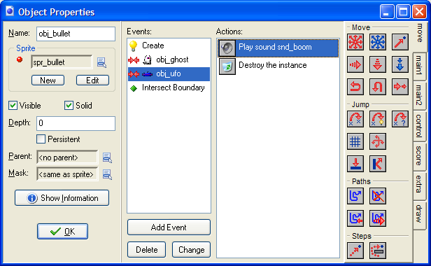 The player needs some big points if they hit the UFO and we need to remove the UFO and bullet from the screen. Add a Collision Event to the UFO object window - the collision should be with the bullet object.
