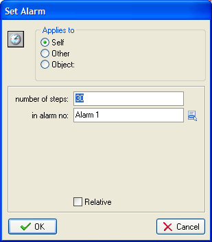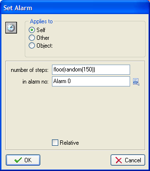 Add an Alarm Event for Alarm0. Drag in a Move Fixed icon and fill it in to make the mole move up the screen at a speed of 3. Follow this with another Set Alarm action, filling in this pop-up as follows,