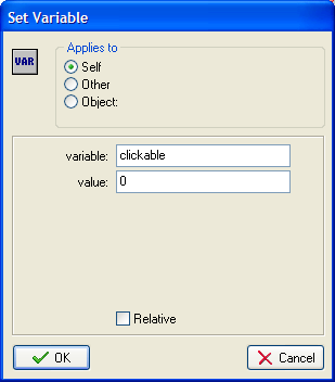 Also in the Create Event, we set a variable to control when the mole is clickable. We will start off with this variable set to 0. When it is set to 1, the mole can be clicked. Drag in a Set Variable action to do this, filling in the pop-up as shown.