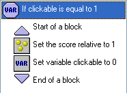 This event increases the score when the player clicks on a mole which is poking its head out. We need to check the value of the variable clickable so that we know that the mole is in the correct position to be whacked. If so, we increase the score and set the variable back to 0 so that the player can't double whack the mole. You can do this with the following actions,