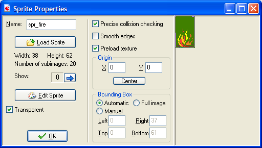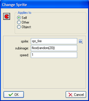 The fire graphic is animated so that the flames flicker. If you place 2 of these graphics next to each other they will flicker at exactly the same time. That looks a bit odd. You can sort this out by starting the animations at a random point. Do this by adding a Create Event to the fire object and dragging in a Change Sprite action. Fill the pop-up in as shown below,
