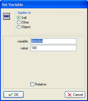 The movement of the snake will be controlled using Key Press Events for each of the arrow keys. Start by adding a Key Press Event for the left arrow key. Drag in a Set Variable icon and fill in the window as shown,